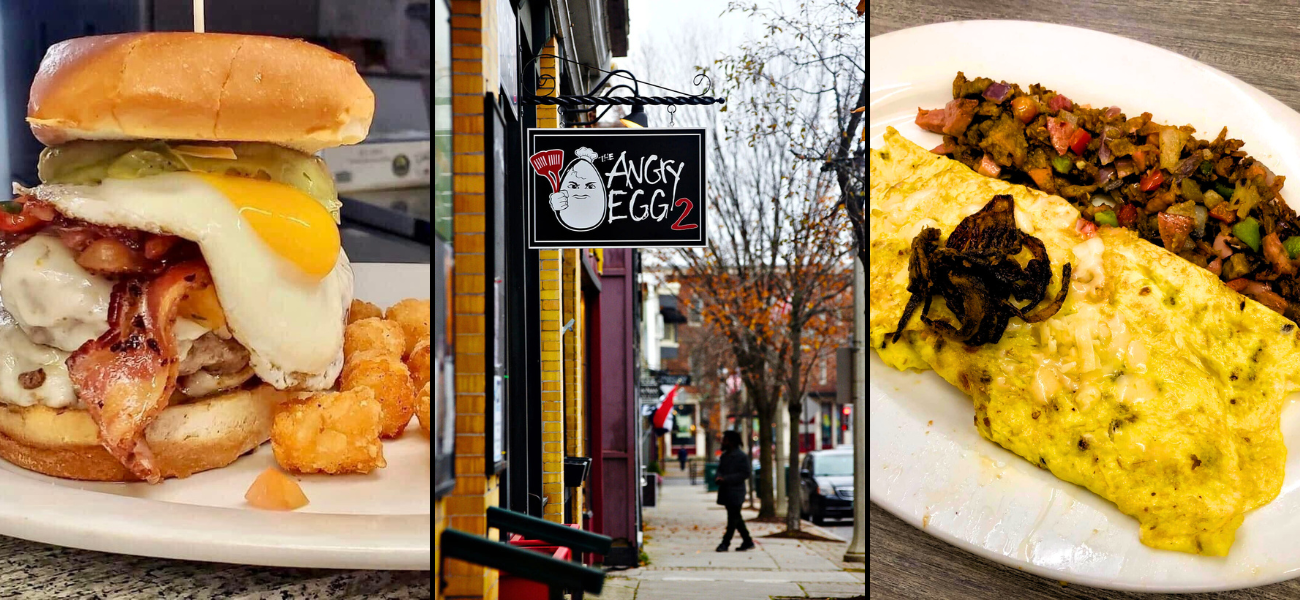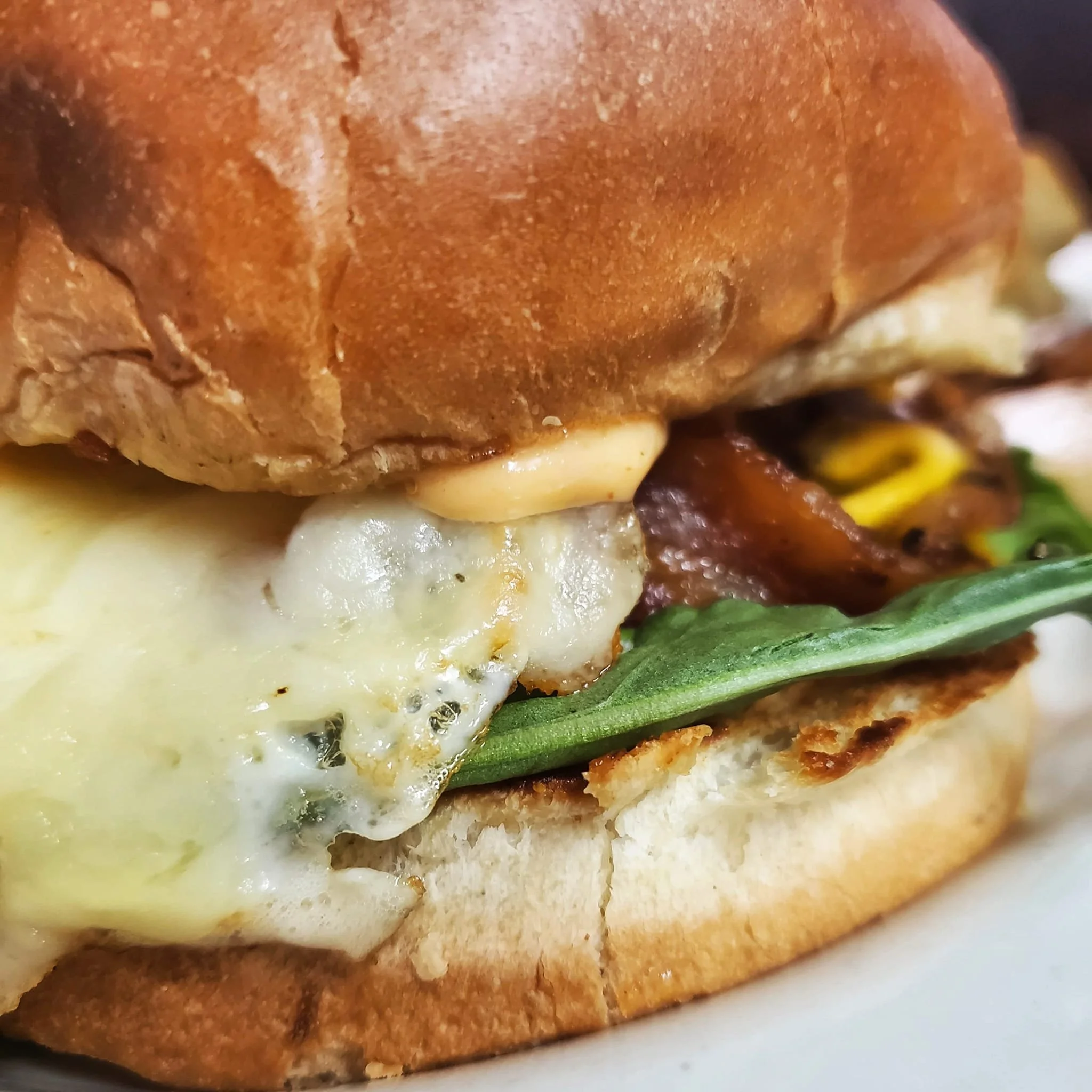 8 oz. chicken breast with Angry Egg spiced rub, house-made coleslaw, cheddar cheese, pickle, and a brioche bun.